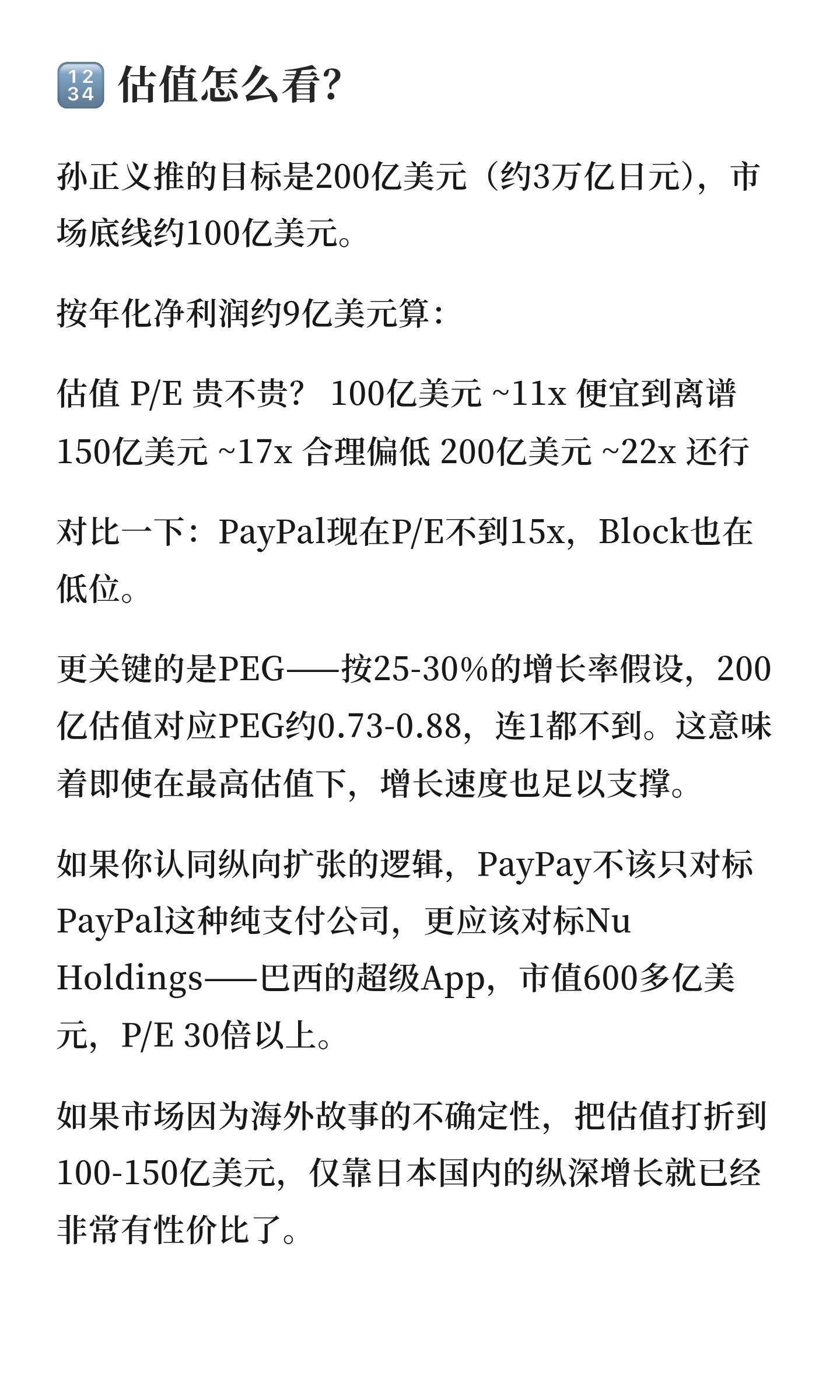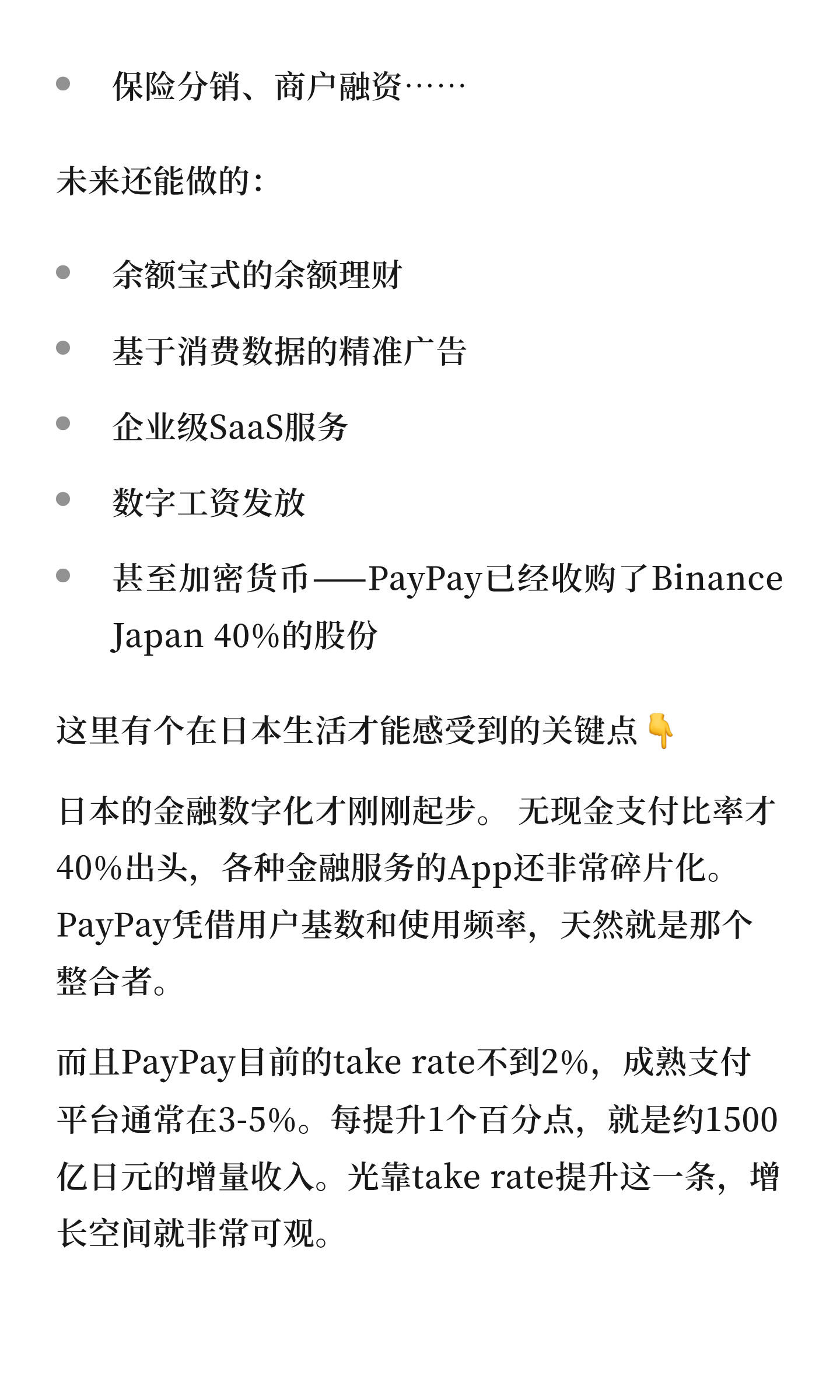 而且PayPay目前的take rate不到2%,成熟支付平台通常在3-5%。每提升1个百分点,就是约1500亿日元的增量收入。光靠take rate提升这一条,增长空间就非常可观。